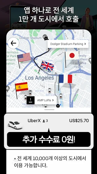 Uber 네트워크를 통해 전 세계 1만 개 이상의 도시에서 편리한 차량 호출 서비스를 경험하실 수 있습니다.