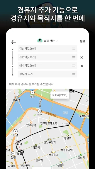 차량 호출 시 앱 내 경유지 추가 기능을 활용해보세요. 기사님께 말하지 않아도 호출 한 번으로 원하는 경유지와 최종 목적지까지 편안하고 합리적으로 이동할 수 있습니다.