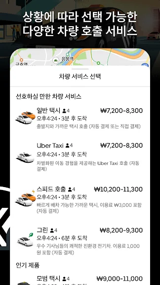 차별화된 이동 경험을 제공하는 Uber Taxi부터, 최대한 가까운 택시를 호출할 수 있는 일반 택시, 빠르게 배차 가능한 스피드 호출 옵션과 친환경 전기차 옵션까지!