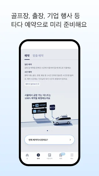 타다 - 새로운 이동 기준 (택시/호출예약/공항이동) 어플에 대한 스크린샷 정보가 필요하시다면 아래 이미지를 참고하시기 바랍니다.