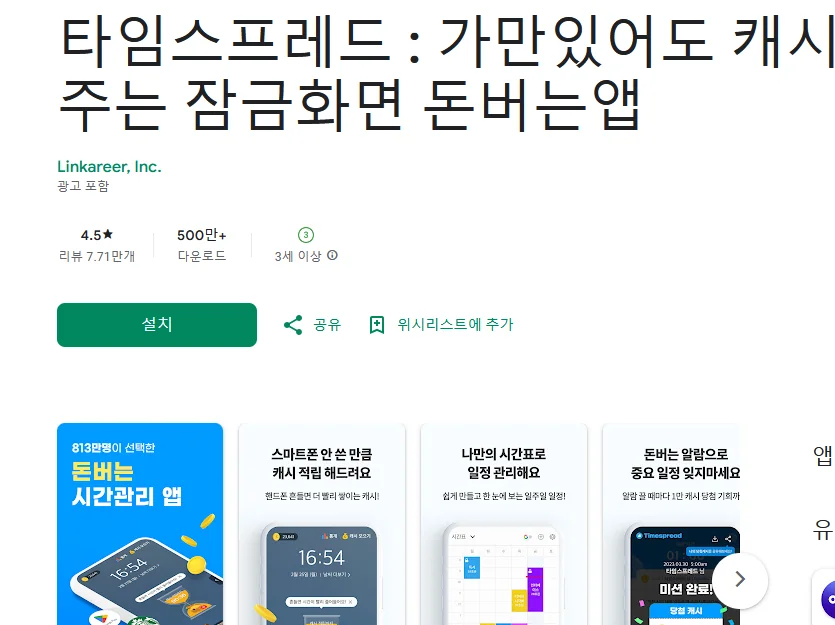 이 어플은 구글플레이스토어에서 "돈버는"로 검색했을때 1번째로 나오는 어플입니다. 아래는 타임스프레드 : 가만있어도 캐시 주는 잠금화면 돈버는앱 어플에 대한 자세한 설명이니 참고하세요.