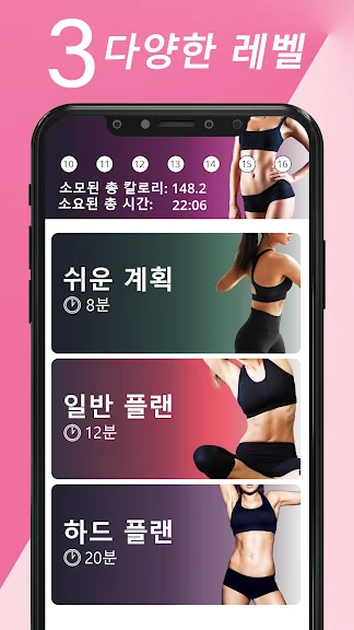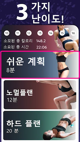 -전문가가 설계한 3가지 난이도(쉬움, 중간, 어려움)에 기반한 복근 운동.