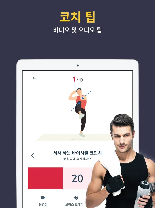 - 전문가가 설계한 3가지 난이도(쉬움, 중간, 어려움)에 기반한 복근 운동.