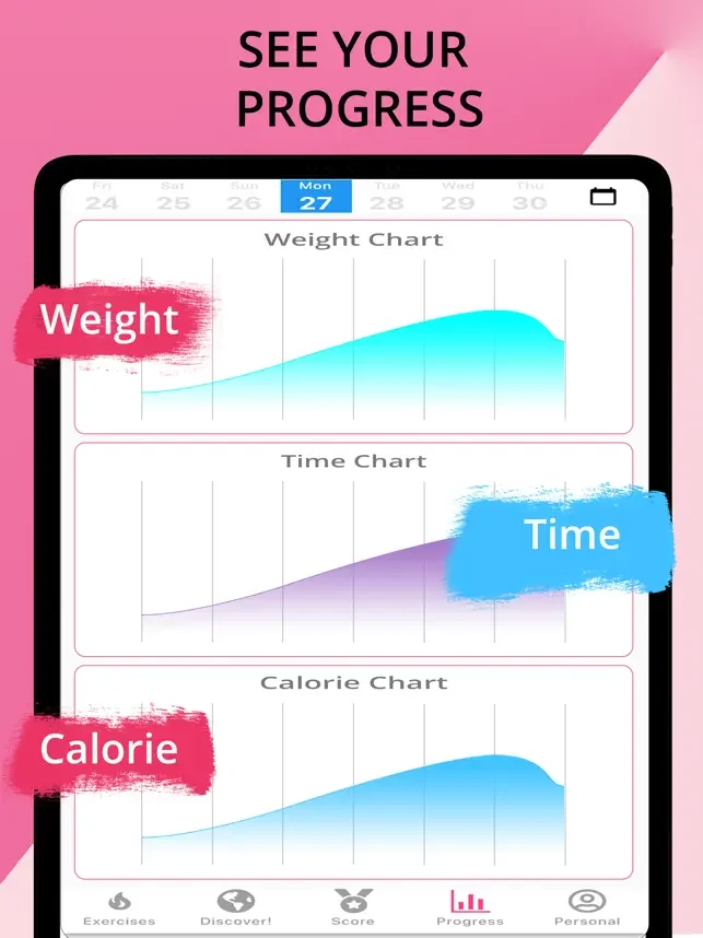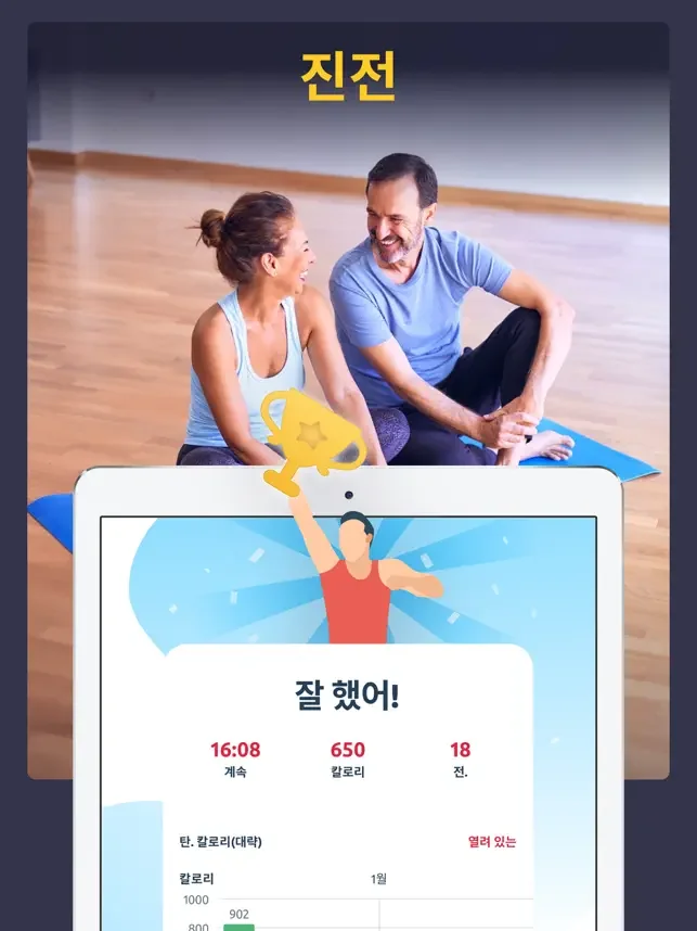 운동기구나 헬스장, 코치 없이 집에서 바로 할 수 있어요. 진행 상황 페이지에서 소모 칼로리와 체중 감량을 쉽게 확인할 수 있답니다.