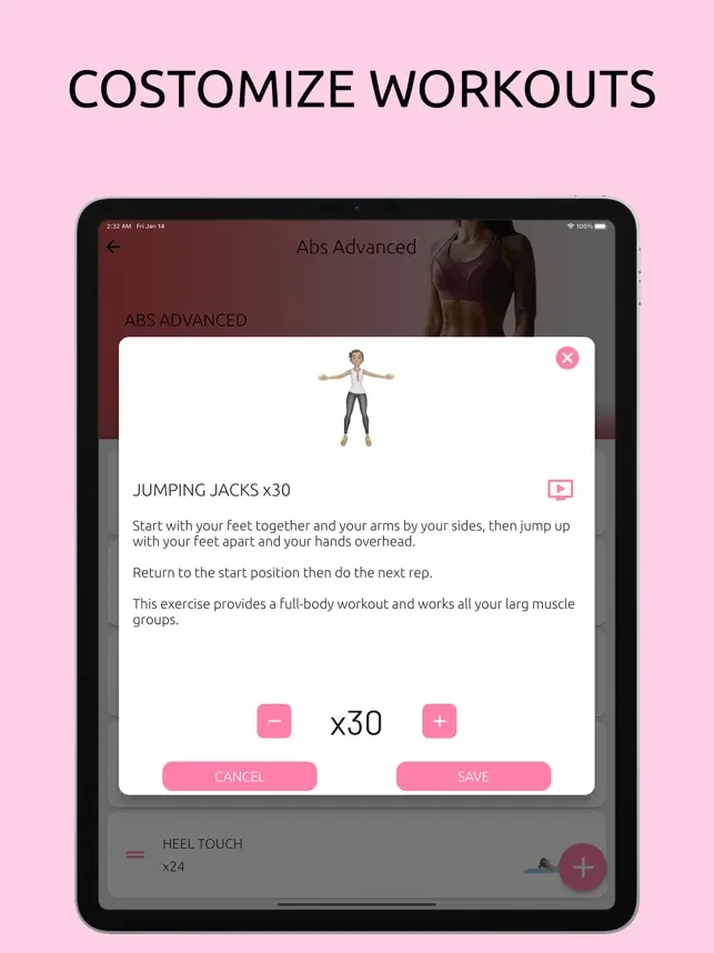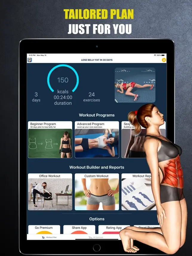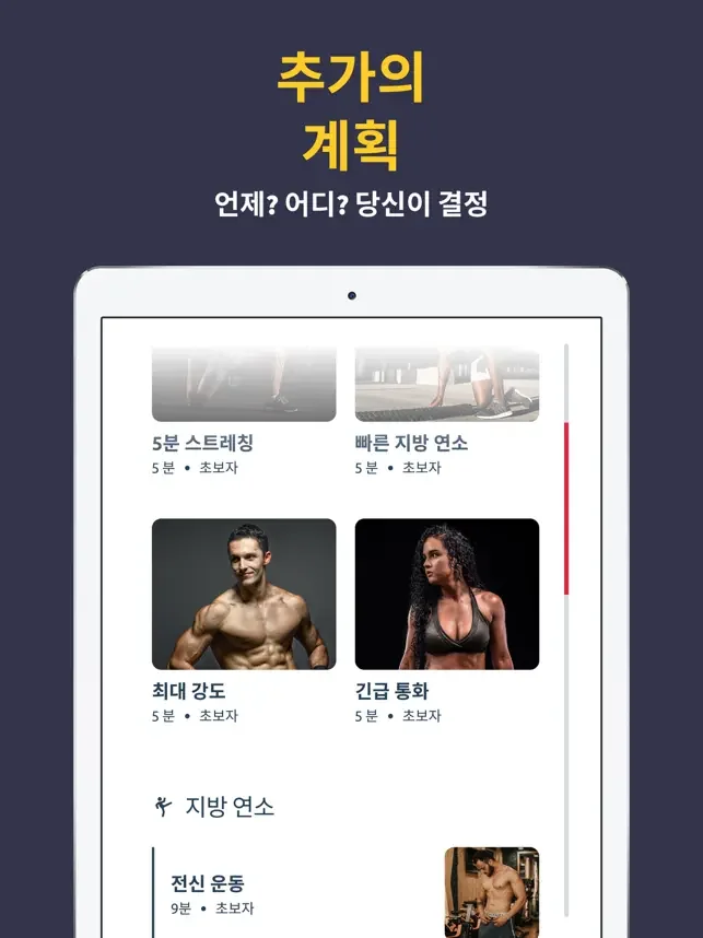 우리의 체계적인 접근 방식으로 건강하고 효과적인 운동 프로그램을 만들면, 강한 몸과 에너지, 평평한 복부, 식스팩, 지방과 칼로리 연소 효과를 얻을 수 있어요. 운동은 간단하고 즐거우며, 유용한 애니메이션과 동영상도 제공해요.