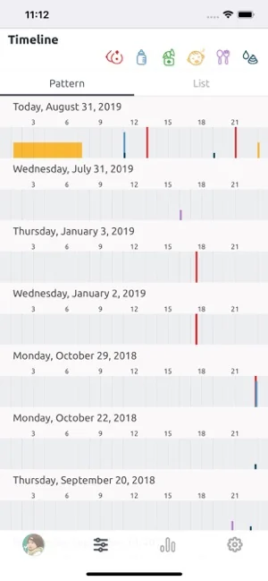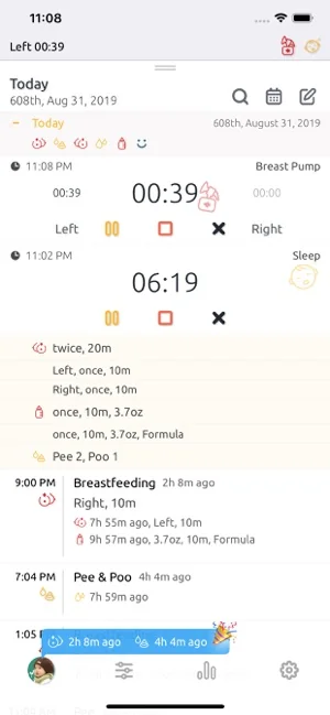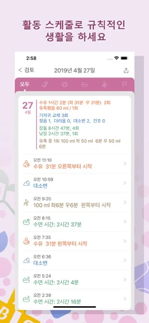 타임라인에 수유, 육아 기록에 대한 모든 것이 표시됩니다.