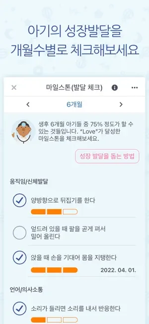 -월령별 발달 체크 : 아기 개월수에 맞는 핵심 발달 정보를 볼 수 있습니다. 월령별 마일스톤 체크로 아기의 발달 지체 가능성 징후를 조기에 발견하세요.