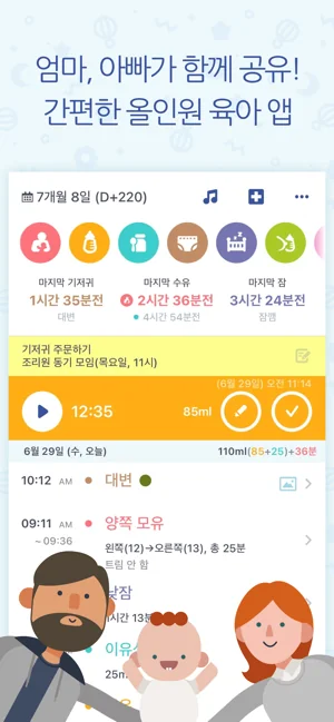 -간편한 기록 방식 : 모유수유, 분유, 이유식, 체온, 약, 기저귀, 잠 등의 활동을 최소한의 터치로 기록할 수 있습니다. (사진 첨부 가능)