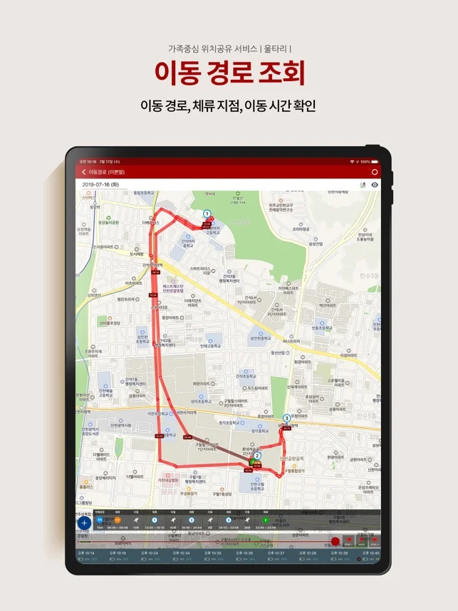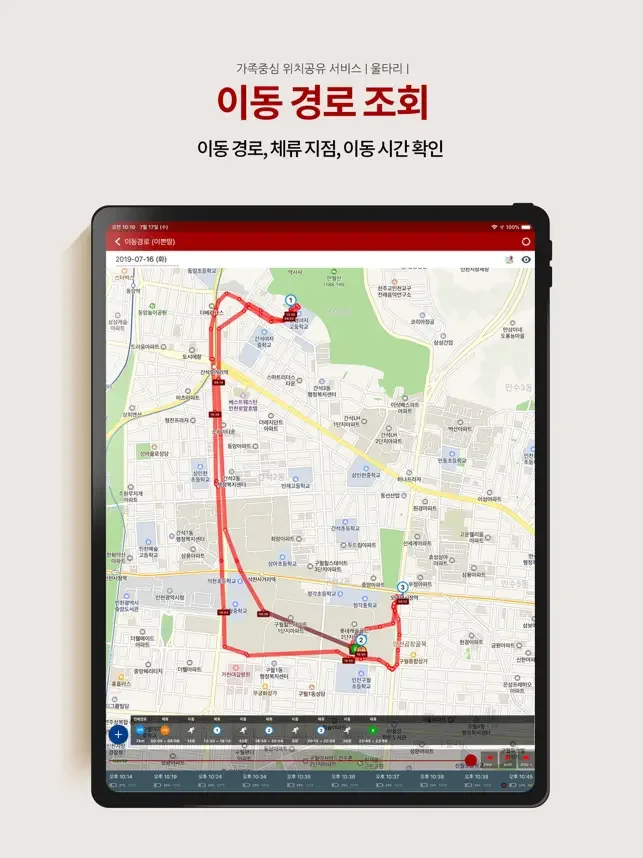 언제 어느 위치에서 얼마나 체류하였는지를 경로트래킹 기능을 통해 확인할 수 있습니다.