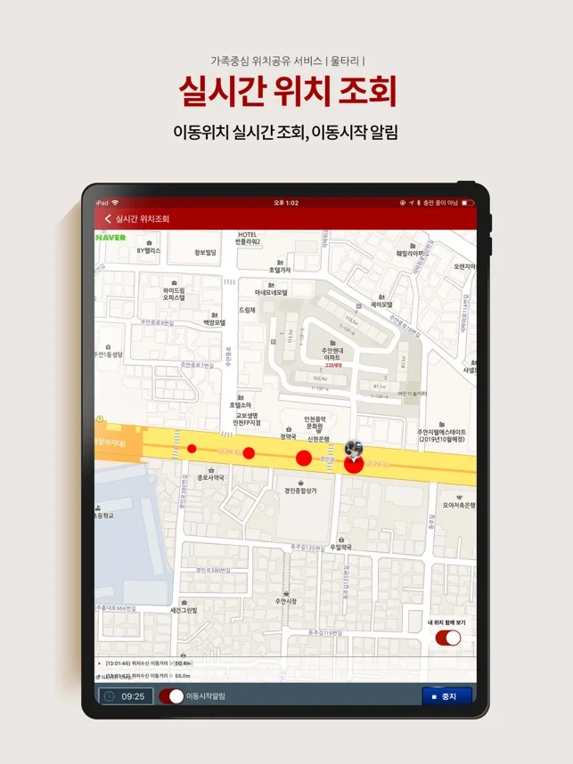 현재위치, 이동경로조회, 지정장소 도착/출발 알림, 체류시간/이동시간 요약 등 하나의 앱으로 모든 활동을 통합 조회할 수 있는 국내 유일의 통합 위치추적기 입니다.