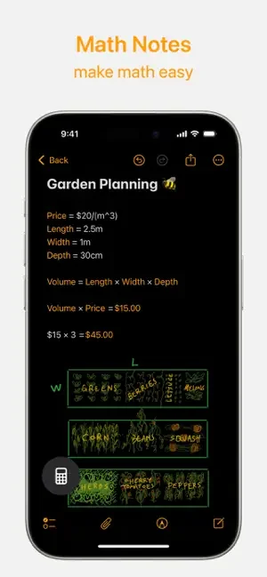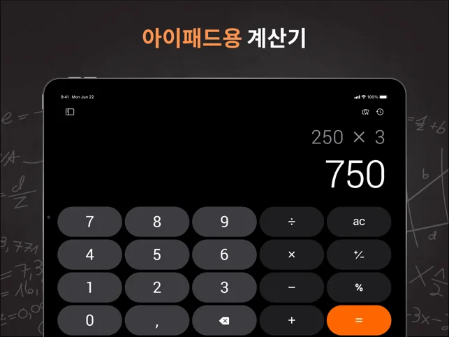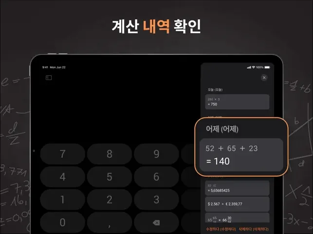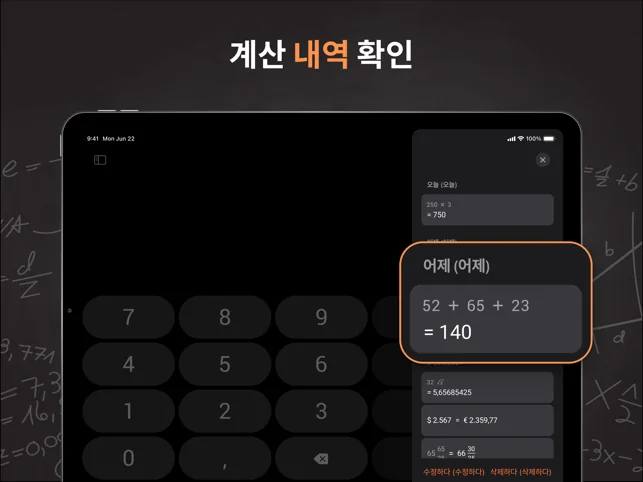 iPad에서 수식을 입력하거나 Apple Pencil로 쓰고 등호를 입력하면 수학 메모가 곧바로 해당 표현식을 인라인으로 풀어줍니다. 수학 메모는 기본 및 공학용 계산기와 동일한 기능을 지원하며, 단위 변환 및 수식 세로 쓰기와 같은 기능도 제공합니다.