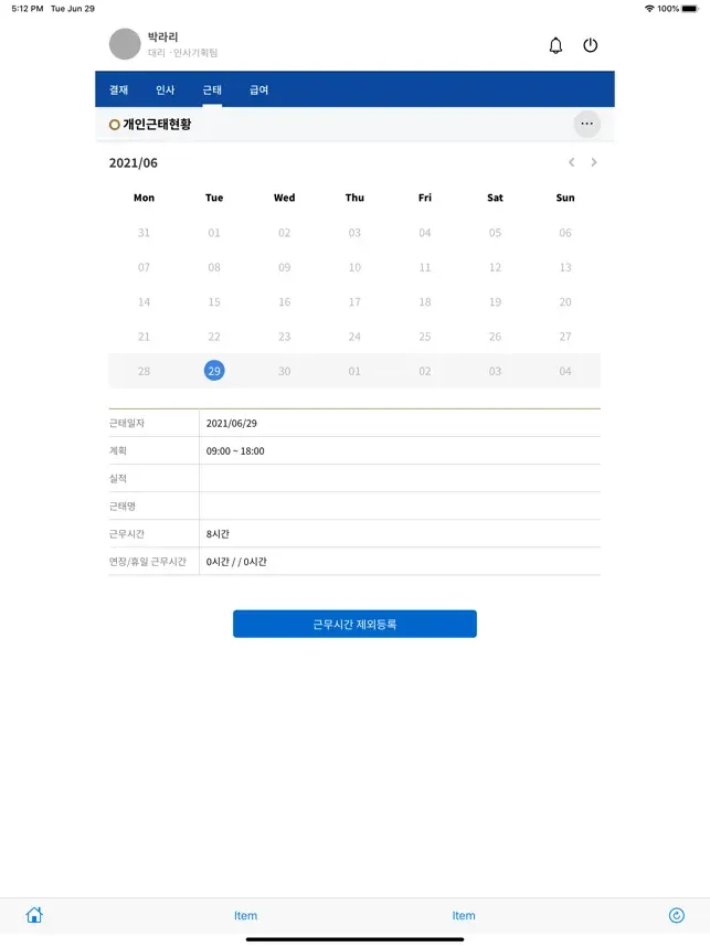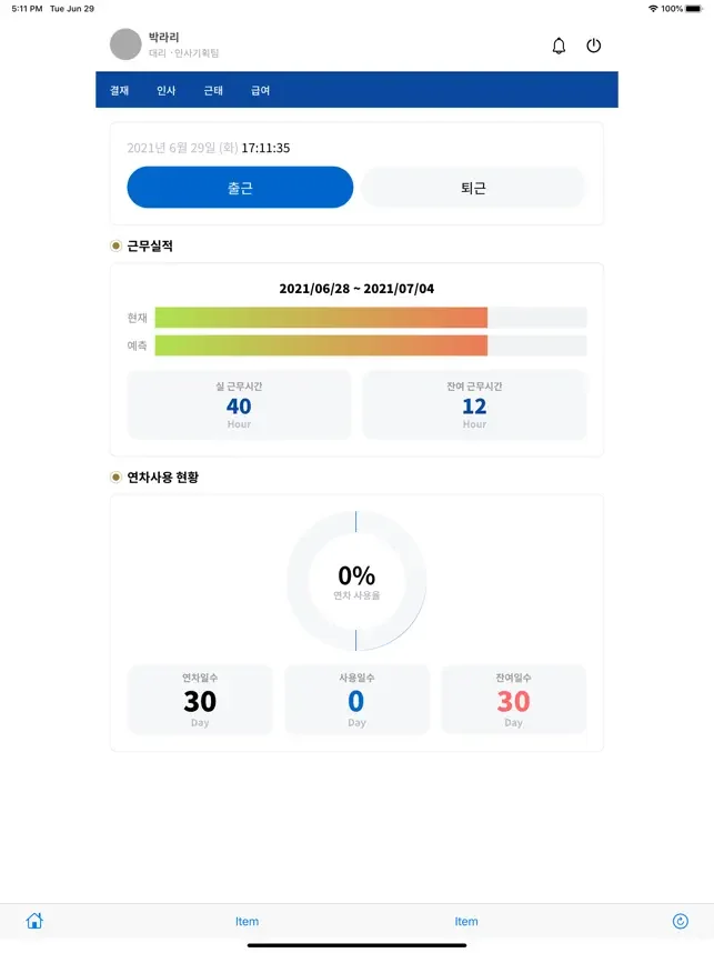 - 개인별 근무 스케쥴, 출퇴근 등록, 근태 신청, 근태 현황등 기능 제공