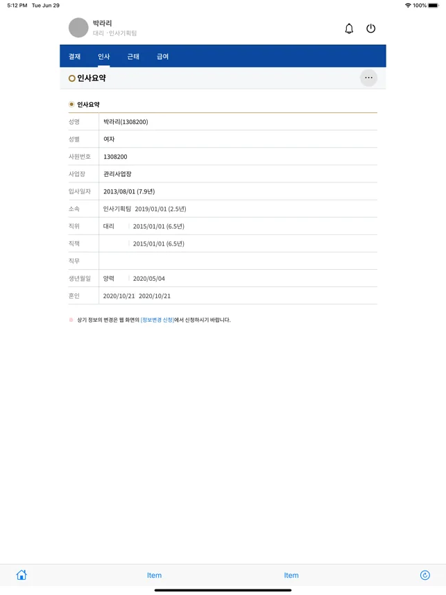 - 연도별 급여 명세서 조회 및 상세 내역 조회, 급여 계좌 변경 기능 지원으로 급여 업무의 효율성과 생산성, 정확성을 보장