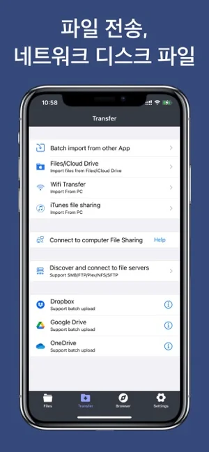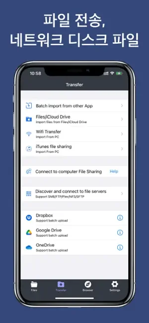 파일 관리자 & 클라우드 오거나이저를 사용하면 Dropbox, Google Drive, SMB, FTP, WEBDAV 등 여러 클라우드 서비스를 쉽게 연결하고 관리할 수 있으며, 모든 것을 한 곳에서 처리할 수 있습니다. 또한 iOS 기본 파일 앱과 완벽하게 통합되어, 앱과 클라우드 저장소 간에 몇 번의 터치만으로 파일을 간편하게 업로드하고 다운로드할 수 있습니다.