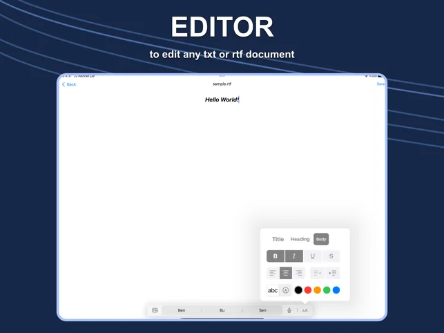- 리치 텍스트 에디터: 내장된 텍스트 에디터를 사용해 앱 내에서 텍스트 문서를 생성하고 편집할 수 있습니다.