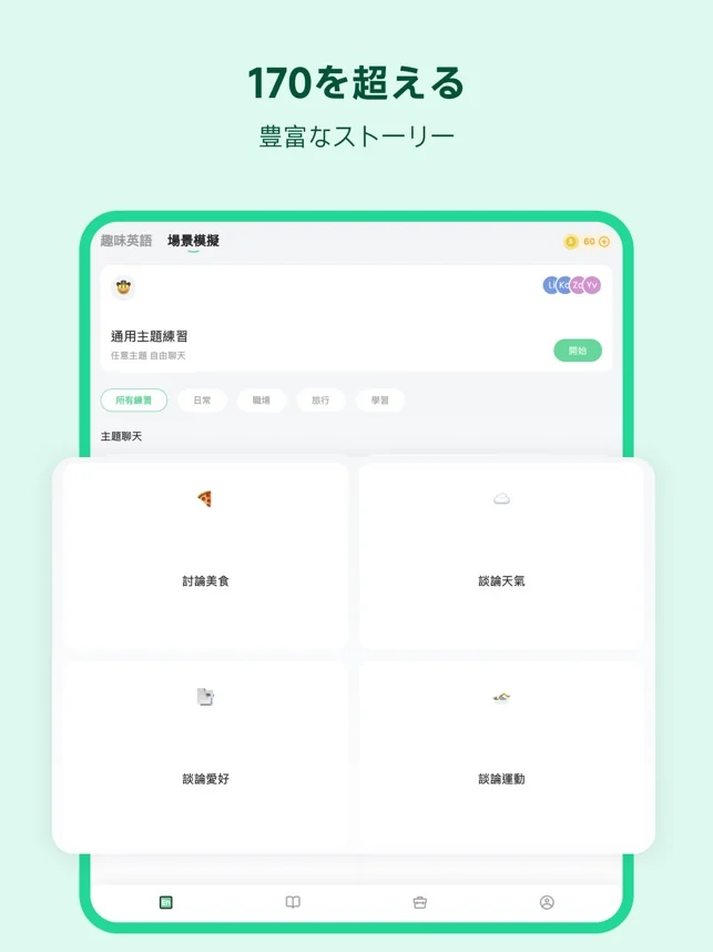 세계 최고의 TalkOn AI 언어 모델을 사용하여 다양한 상황과 난이도의 대화에 적응할 수 있습니다. 실제 사람의 발음과 표현을 AI Talk 대화 코치로 더욱 실감 있게 만듭니다.