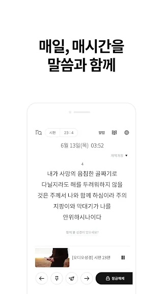 아래는 저절로 성경일독 - 잠금화면 오디오 성경, 말씀 알람 어플에 대한 스크린샷 정보입니다.