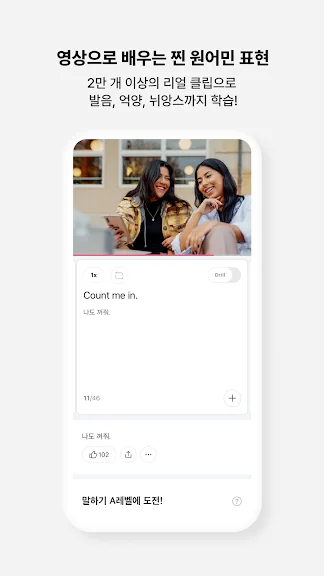 드라마, 영화, 브이로그, 애니메이션 등 20만 개 이상의 현지 영상 콘텐츠로 공부할 수 있습니다. 머리로만 알던 영어가 실제로 어떻게 쓰이는지 입체적으로 이해할 수 있어요. 직접 영상 속 주인공처럼 몰입해서 쉐도잉하다보면, 재미있어서 멈출 수 없을걸요?