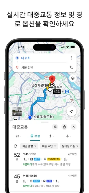 • 도로 상황 및 각종 폐쇄 정보를 포함하여 실시간 교통량 및 대중교통 일정을 볼 수 있습니다.