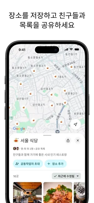 • 즐겨찾는 저장한 장소로 맞춤 목록을 만들고 목록을 다른 사용자와 공유하세요.