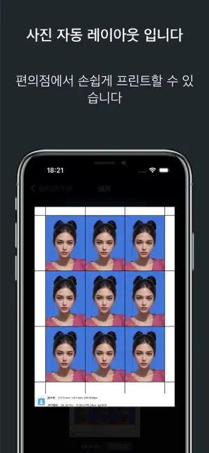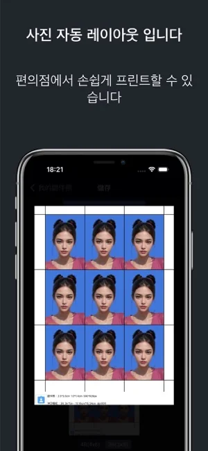 이 앱은 AirPrint 호환 프린터에서의 인쇄를 지원합니다. 필요할 경우 인쇄 크기는 앱에서 조정할 수 있습니다. 자르기 쉽도록 여권 사진은 자동으로 약간 더 크게 인쇄됩니다.