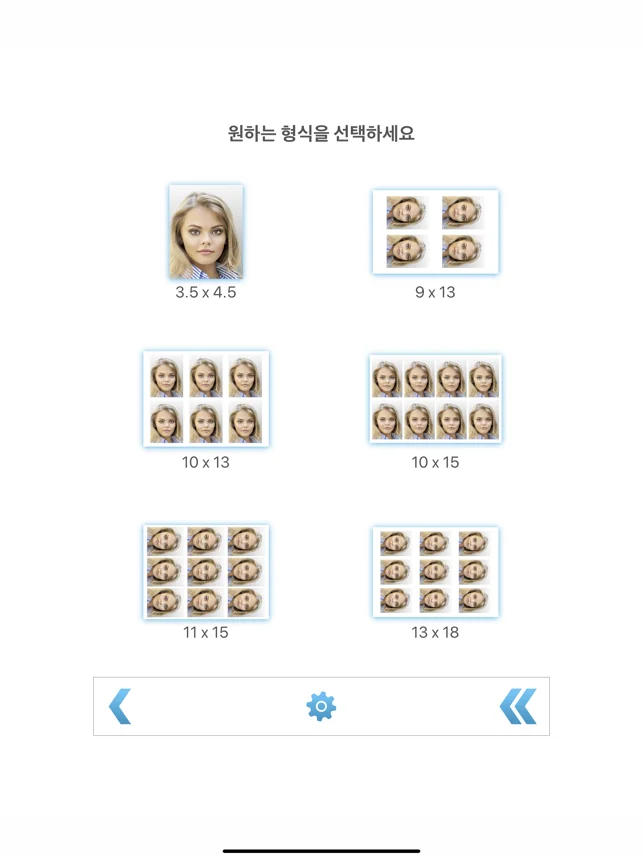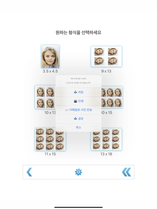 이 앱은 인화지 위의 여러 장의 여권 사진을 저장 또는 인쇄하거나 이메일로 보낼 수 있습니다. 결과 이미지는 직접 인쇄하거나 나중에 원하는 인터넷 사진관에서 주문할 수 있습니다 (앱으로부터가 아님).