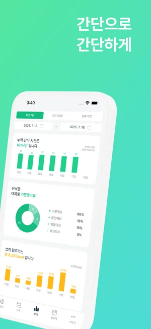 간단은 간헐적 단식을 좀 더 쉽고 체계적으로 관리할 수 있게 도와주는 앱이에요. 복잡한 기록이나 알림 없이도 자연스럽게 건강한 습관을 만들어가는 데 큰 도움이 될 거예요.