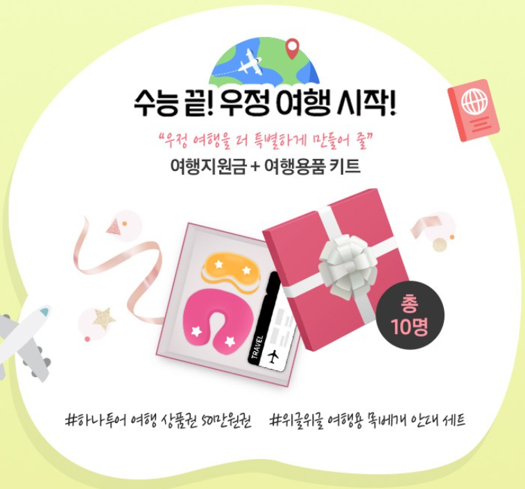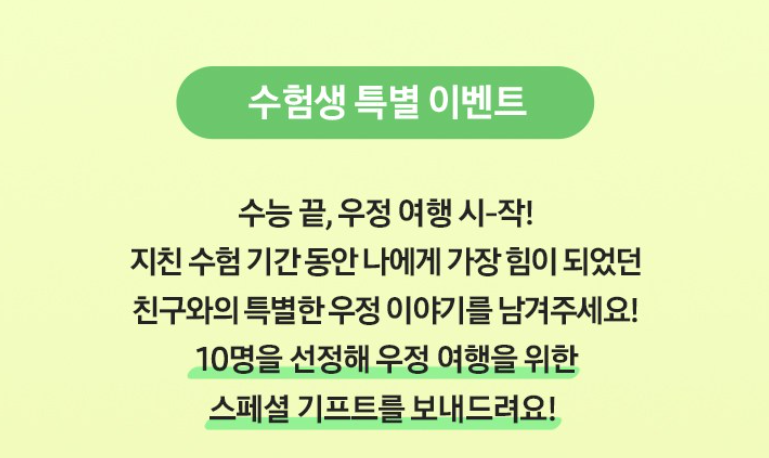 지친 수험기간 동안 나에게 가장 힘이 되엇던 친구와의 특별한 우정이야기를 남겨주면 10명을 선정해 우정여행을 보내드립니다. 여행 지원금 무료 50만원 상품권 그리고 여행용 목베게 안대세트를 드립니다.