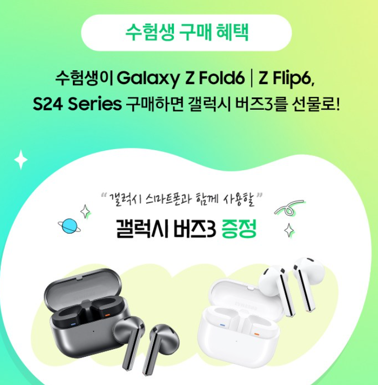 수능 수험생을 대상으로 한 특별한 혜택 소식을 준비했습니다! 고생한 수험생 여러분을 응원하는 마음을 담아, 삼성전자가 갤럭시 Z 폴드6, Z 플립6, 그리고 S24 시리즈를 구매하는 분들께 특별한 선물을 제공합니다. 바로 삼성의 최신 무선 이어폰 갤럭시 버즈3을 증정하는 이벤트입니다. 이 프로모션은 수험생 여러분의 노력에 보답하기 위해 마련된 것으로, 공부와 시험 준비로 고생한 하루를 마무리하며 음악과 함께 힐링할 수 있는 기회를 선사합니다.